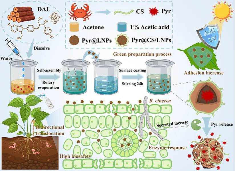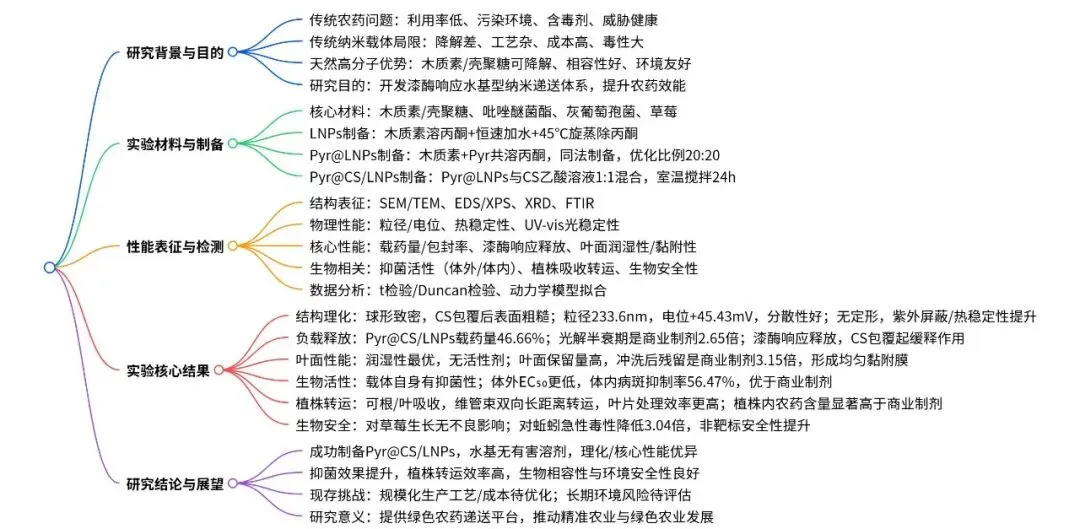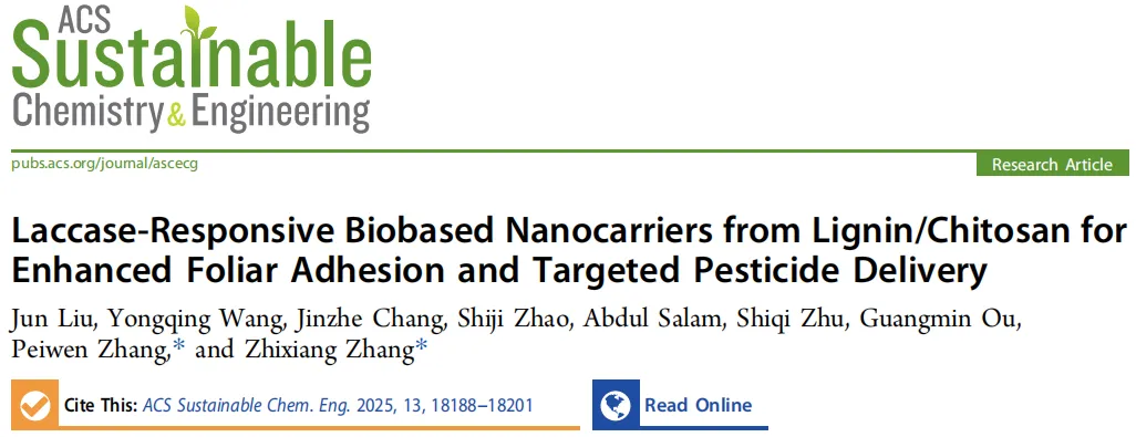 华南农业大学张志祥老师与张佩文老师团队合作在《ACS Sustainable Chemistry & Engineering 》发表名为"Laccase-Responsive Biobased Nanocarriers from Lignin/Chitosan for Enhanced Foliar Adhesion and Targeted Pesticide Delivery" 的期刊论文。该团队聚焦绿色农业痛点,开发了一种高效、环保的农药递送系统(Pyr@CS/LNPs),核心价值在于解决传统农药利用率低、污染环境的问题。