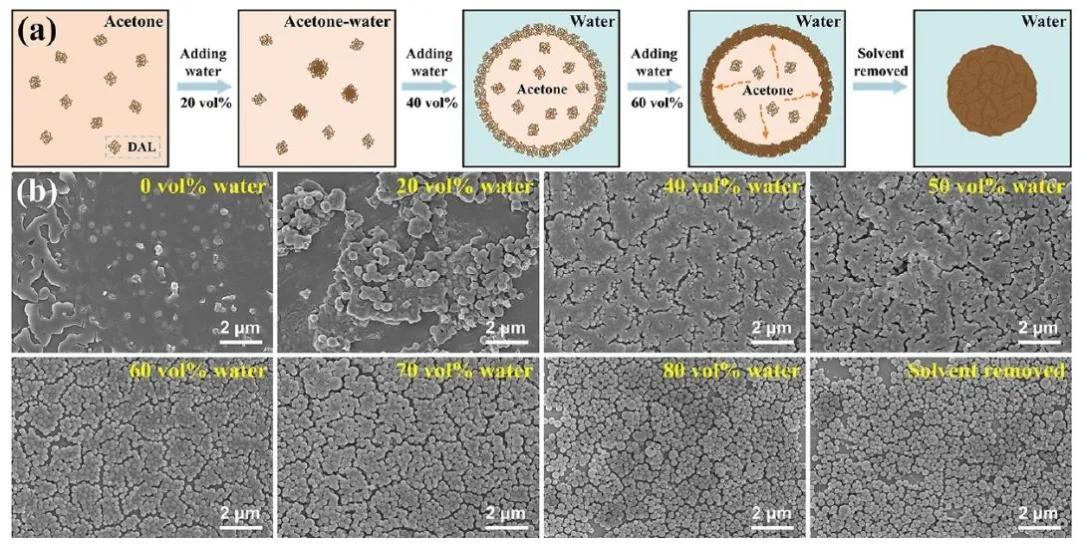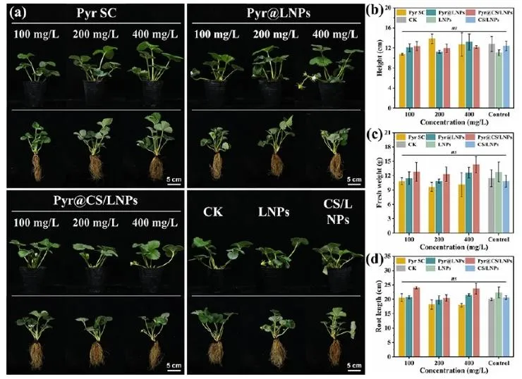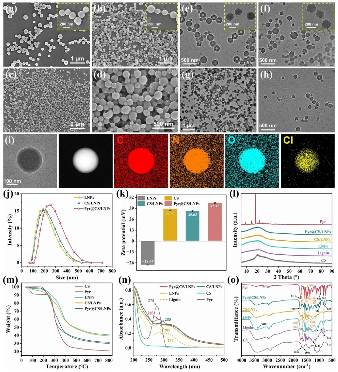 木质素是自然界中唯一的芳香族高分子聚合物,也是地球上储量仅次于纤维素的第二大可再生生物质资源,作为木材的主要成分,可从制浆造纸工业的副产物中提取获得。木质素无毒、成本低廉、易获取、可再生,兼具两亲性和紫外屏蔽特性,因此被广泛研究并用作农药递送领域的载体材料。目前,木质素纳米载体的主要制备方法包括沉淀法、机械法、聚合法和自组装法,其中自组装法是木质素分子在溶液中的常规聚集过程,因操作简单、可规模化制备且环境友好,得到了广泛应用。壳聚糖是自然界中唯一的阳离子多糖,凭借独特的生物降解性、生物相容性、抗菌活性和黏附性能,成为农业应用领域的理想材料。利用带相反电荷的壳聚糖对木质素纳米载体进行表面包覆,是一种提升其实际应用价值的简便高效方法。草莓是全球广泛种植的经济作物,每吨经济价值可达 2671.3 美元。灰葡萄孢菌作为第二大重要植物病原真菌,会导致草莓的产量和品质大幅下降。相关研究表明,灰葡萄孢菌在侵染过程中会分泌大量草酸,降低侵染位点的 pH 值,刺激漆酶等多种酶的产生并提高其活性,而漆酶参与木质素的降解过程,其酶解作用可断裂木质素的复杂芳香环网络,生成低分子量酚类化合物。这一降解机制为农药的靶向释放提供了生物触发条件:当漆酶作用于木质素基纳米载体时,包封的农药可在侵染位点快速释放。该研究首先通过自组装法合成载吡唑醚菌酯木质素纳米颗粒(Pyr@LNPs),再利用静电作用在其表面修饰壳聚糖,制备得到漆酶响应型纳米递送体系(Pyr@CS/LNPs)。本研究对制备的 Pyr@CS/LNPs 进行了全面表征,并对其农药负载性能、光稳定性、控释行为、叶面黏附性等关键性能进行了评价;探究了该制剂对灰葡萄孢菌的体外和体内杀菌活性;此外,还研究了 Pyr@CS/LNPs 在草莓植株中的吸收、转运规律及生物安全性,旨在阐明壳聚糖 / 木质素纳米载体作为可持续、可控农药递送平台的应用潜力。图1系统包含木质素纳米颗粒(LNPs)在丙酮水溶液中制备过程的示意图(a)和不同水含量下的扫描电镜(SEM)图像(b),直观展现了 LNPs 的形成过程与形貌演变:水不溶性木质素可完全溶解于丙酮,向该体系中逐步加水时,木质素分子会因溶剂极性改变发生自组装,水含量达 20% 时疏水性木质素分子开始聚集为局部簇状,随水含量持续增加,木质素分子进一步自组装,60% 水含量时多数转化为典型球形的 LNPs,80% 水含量时该过程基本完成,后续经旋转蒸发除去丙酮即可获得稳定的 LNPs 水悬浮液;而其形成机制主要是木质素分子在水 - 丙酮两相界面形成膜结构,随水含量增加膜内外压力差引发相转变,木质素分子通过 π-π 相互作用层层自组装聚集在膜内表面,最终形成内部致密的 LNPs,其表面的小孔则是残留丙酮在膜内外压力差作用下突破表面所致,木质素分子的自组装主要由 π-π 相互作用驱动,且倾向于形成球形以降低表面能。图1:(a)木质素纳米颗粒在丙酮水溶液中的制备过程示意图;(b)不同水含量条件下的扫描电镜图像图2为Pyr@CS/LNPs 的制备流程示意图,该制备过程分两步完成,先通过自组装法制备载药木质素纳米颗粒,再利用静电作用完成壳聚糖的表面包覆:首先将木质素与吡唑醚菌酯(Pyr)共同溶解于丙酮中,向该混合溶液中按一定速率加入水,借助溶剂极性改变引发的自组装作用形成复合体系,随后通过旋转蒸发去除丙酮,得到稳定的载吡唑醚菌酯木质素纳米颗粒(Pyr@LNPs)水悬浮液;接着将制备好的 Pyr@LNPs 悬浮液缓慢加入至 1% 乙酸配制的壳聚糖(CS)溶液中,二者按 1:1 的体积比混合后在室温下磁力搅拌 24 h,利用带正电的壳聚糖与带负电的 Pyr@LNPs 之间的静电相互作用,使壳聚糖成功包覆在 Pyr@LNPs 表面,最终制得漆酶响应型的 Pyr@CS/LNPs 纳米递送体系。图3通过 SEM、TEM、EDS、动态光散射、XRD、TG、UV-vis 和 FTIR 多种表征手段,系统分析了 LNPs、CS/LNPs、Pyr@CS/LNPs 的理化特性:三者均为内部致密的规则球形,CS 包覆使 CS/LNPs 和 Pyr@CS/LNPs 表面变粗糙,EDS 证实 Pyr@CS/LNPs 中存在氯元素,说明农药包封成功;三者 Z 平均粒径依次为 183.0、191.3、233.6 nm,ζ 电位从 LNPs 的 - 28.07 mV 经 CS 包覆转为 + 35.63 mV,载药后升至 + 45.43 mV,电位绝对值均大于 30 mV 保证了分散稳定性;XRD 显示 Pyr 为高结晶态,而三种纳米颗粒均为无定形且无 Pyr 特征晶峰,表明农药以无定形包封;TG 曲线验证了 CS 的成功包覆和 Pyr 的有效负载,且 Pyr@CS/LNPs 能提升农药的热稳定性;UV-vis 光谱中木质素特征峰经自组装和载药依次蓝移,且 LNPs 和 CS/LNPs 紫外吸收显著增强,具备优异的紫外屏蔽能力;FTIR 光谱中三者均保留木质素特征峰,Pyr@CS/LNPs 同时出现 Pyr 的特征峰,结合各表征结果,证实了 Pyr@CS/LNPs 纳米递送体系的成功构建,且各组分间存在静电作用、氢键和 π-π 相互作用。图3:(a-h)透射电镜图像;(i)能谱分析图像;(j)平均粒径;(k)Zeta电位;(l)X 射线衍射图谱;(m)热重曲线;(n)紫外 - 可见吸收光谱;(o)傅里叶变换红外光谱。图4通过 XPS 全谱与高分辨谱分析,明确了 LNPs、CS/LNPs 和 Pyr@CS/LNPs 的表面元素组成与化学态变化,验证了壳聚糖包覆和吡唑醚菌酯负载的成功性并揭示了组分间相互作用:全谱扫描中 LNPs 仅含 C、O 元素,CS/LNPs 新增 N 元素峰证实壳聚糖包覆,Pyr@CS/LNPs 又出现 Cl 元素特征峰直接证明农药负载;高分辨谱下,CS/LNPs 的 N 1s 峰对应壳聚糖的 N-H、C-N 基团,而 Pyr@CS/LNPs 的 N 1s 出现吡