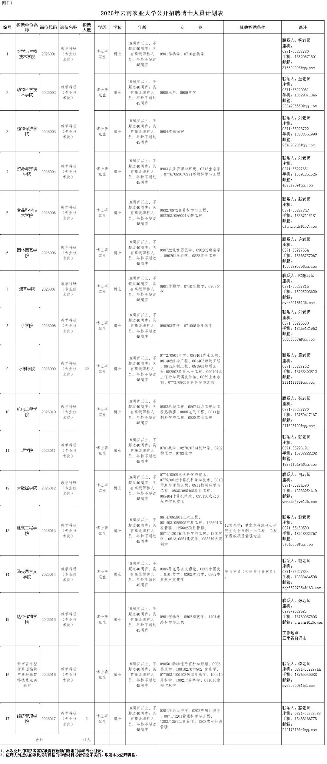 云南农业大学共公开招聘博士人员41名。具体招聘岗位及招聘条件,详见《2026年云南农业大学公开招聘博士人员计划表》(附件1)。