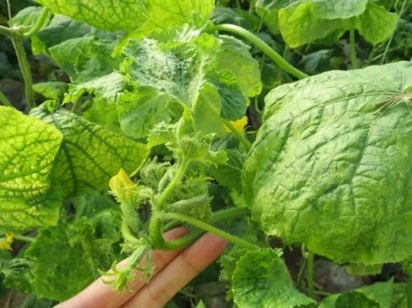 此时一定要摘除龙头上的雌花和瓜扭,让黄瓜上方三节位没有瓜,全力促进植株和主蔓瓜条生长;同时主蔓部分要及时采收成熟瓜,摘除畸形瓜、弱小瓜,并减少留瓜量,待植株恢复健壮后再恢复正常留瓜量。