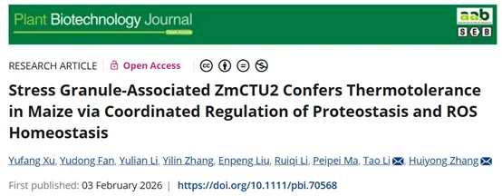 近日,河南农业大学生命科学学院张会勇团队在Plant Biotechnology Journal (中科院一区,IF 10.5)在线发表了题为“Stress Granule-associated ZmCTU2 Confers Thermotolerance in Maize via Coordinated Regulation of Proteostasis and ROS Homeostasis”的研究论文。该研究发现tRNA硫醇化蛋白ZmCTU2作为应激颗粒支架蛋白协同调控蛋白质稳态与抗氧化通路,过表达ZmCTU2可显著增强玉米幼苗和成株期的耐热性,提高热胁迫下的存活率与田间产量,为玉米耐热遗传改良提供了重要基因资源。
