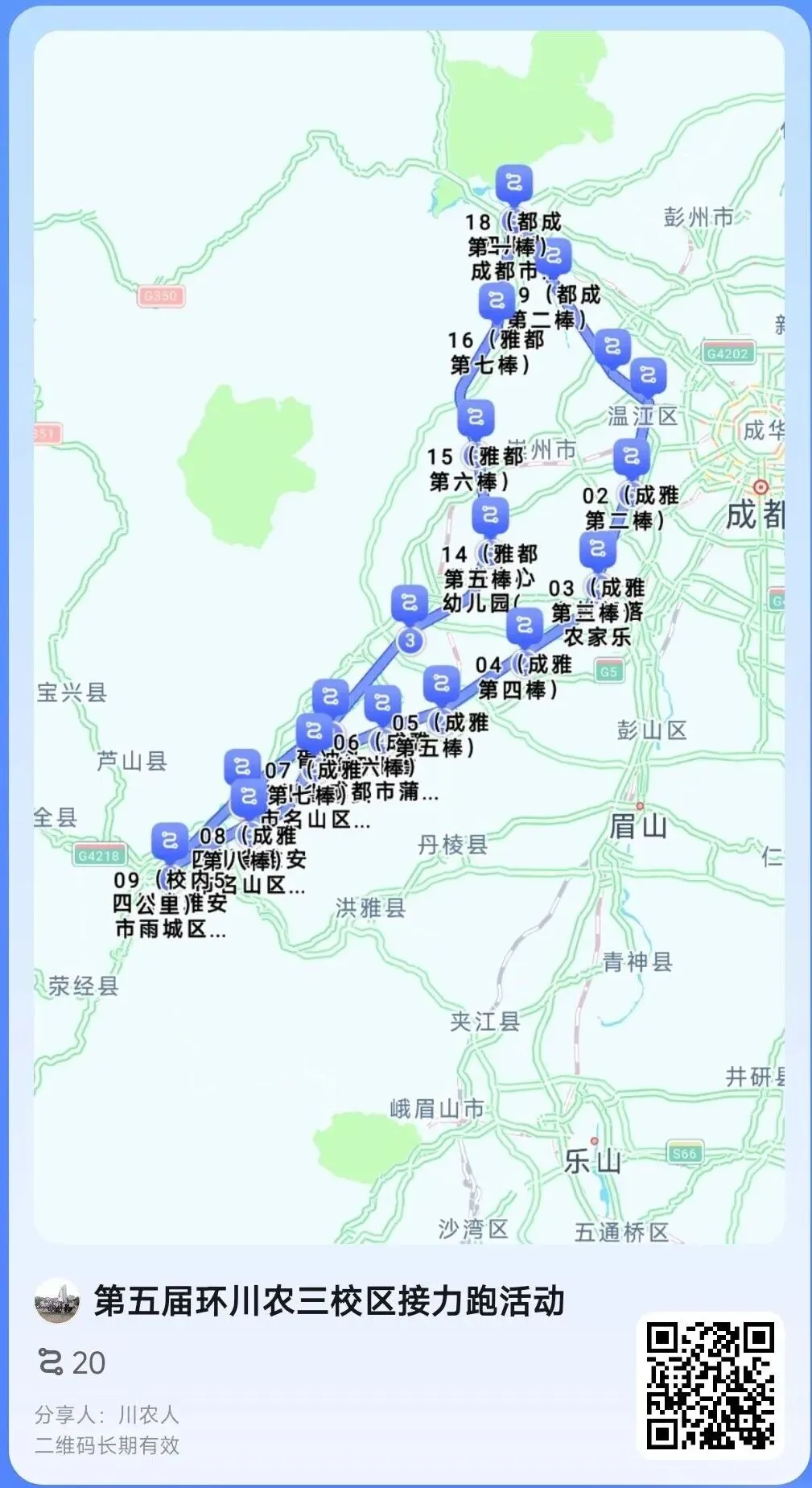 (四)约20:00从雅安校区出发,约4月12日10:30左右抵达都江堰校区,沿108国道、川西旅游环线行进,接力棒号为10-17,其中第17棒全部在都江堰校园内(5公里)。