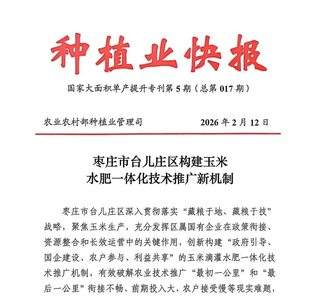 2月12日,农业农村部种植业管理司“种植业快报”主要粮食作物大面积单产提升行动专刊第5期(总第017期)以《枣庄市台儿庄区构建玉米水肥一体化技术推广新机制》为题,刊发我区促进粮食大面积单产提升经验做法,并作为典型在全国推广。枣庄市台儿庄区构建玉米