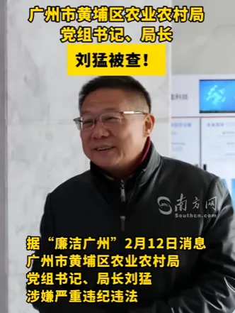 【官宣通报】:2月12号下午15点16分,据公众号"廉洁广州"讯:广州市黄埔区农业农村局党组书记、局长刘猛涉嫌职务违纪违法,目前正接受黄埔区纪委监委审查调查。