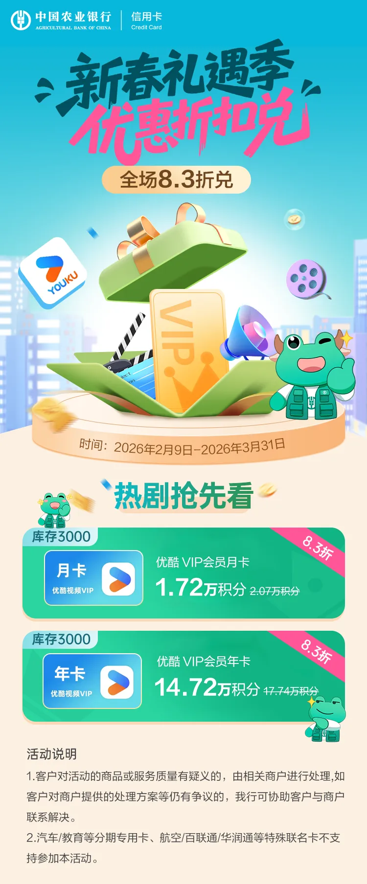 农行信用卡新春礼遇,积分8.3折兑优酷会员【WOW福利】