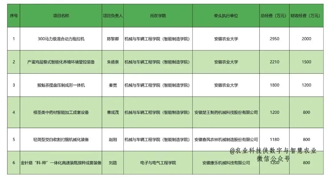 近日,安徽省农业农村厅正式公布农业农村部2025年农机研发制造推广应用一体化试点项目立项计划,安徽农业大学主持获批6项,其中3项由安徽农大教师依托企业申报;主持获批数量占全省立项总数50%,总经费达1.054亿元,其中中央财政经费7100万元,实现安徽农大在农机领域项目上重大突破。