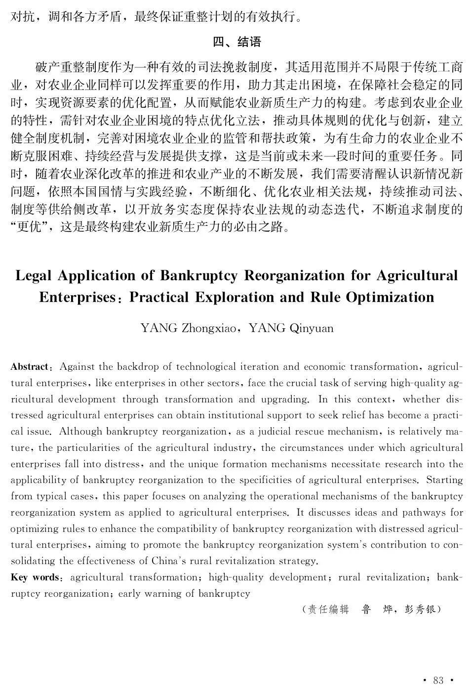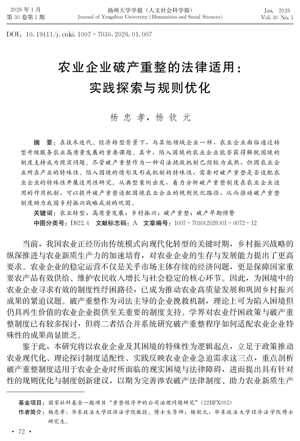 杨忠孝,杨钦元. 农业企业破产重整的法律适用:实践探索与规则优化