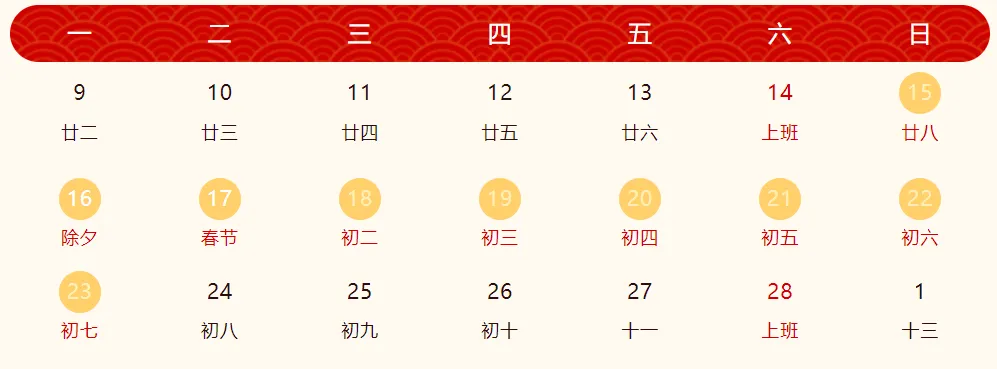 2026年2月15日至2026年2月23日放假调休,共9天。
