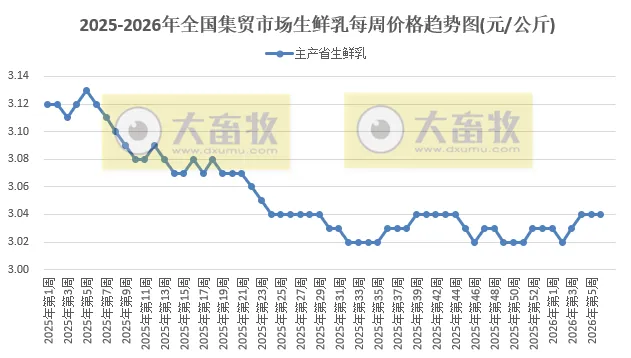 内蒙古、河北等10个主产省份生鲜乳平均价格3.04元/公斤,与前一周持平,同比下跌2.6%。