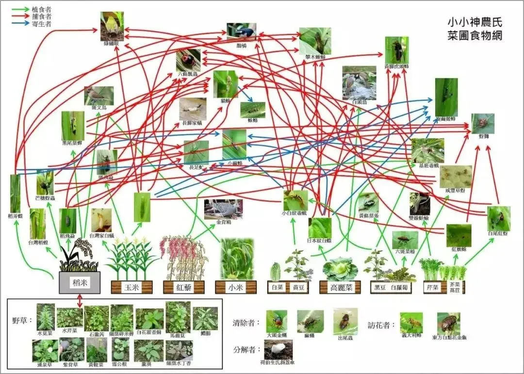 例如使用轮作是为了避免有类似的病虫害在原地会影响作物,但再怎么轮作,土壤或是环境始终会存在这些有害生物,反之,如果建立起土壤与地上的生物多样性,则可以对有害生物进行捕食、寄生、竞争等多方面的生态服务,即使不轮作也不会影响作物生长状况,反而还会更健康。