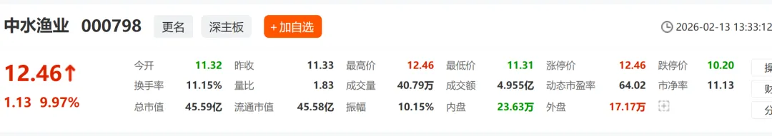 今天中水渔业收盘12.46元,正好卡在“求利”的触发线上。