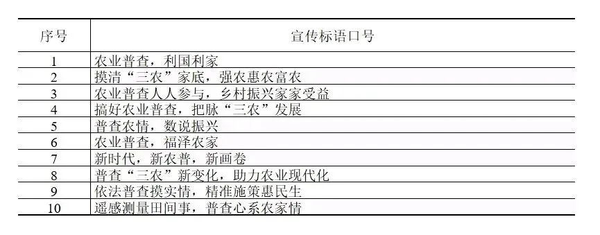 为做好第四次全国农业普查宣传工作,动员社会各界支持配合农业普查,日前国务院第四次全国农业普查领导小组办公室开展了第四次全国农业普查宣传标语口号征集活动。此项活动得到社会各界的广泛关注和积极参与,共收到投稿8100余条。经认真筛选、评审,最终评选出10条优秀作品,将用于第四次全国农业普查宣传活动。现将评选结果公告如下: