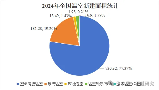 2024年国内温室新建面积943.97公顷,其中塑料薄膜温室完成面积730.32公顷,占比为77.37%,玻璃温室完成面积181.28公顷,占比为19.2%。