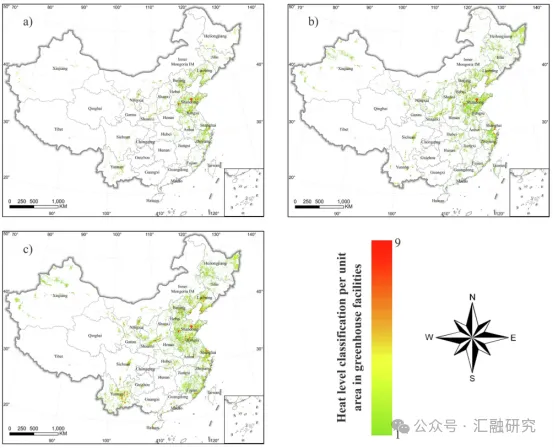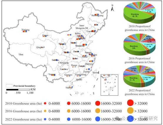 2010—2022年间,中国农业温室种植面积呈显著增长态势。2010年全国农业温室种植总面积为555,460公顷;2016年增至835,923公顷;至2022年进一步扩大至1,295,480公顷。由此推算,全国农业温室面积每6年扩张近50%。2010年时,农业温室主要集中在山东、北京、辽宁等东部省份;而到2022年,云南、新疆等西部地区的温室面积已迅速攀升。