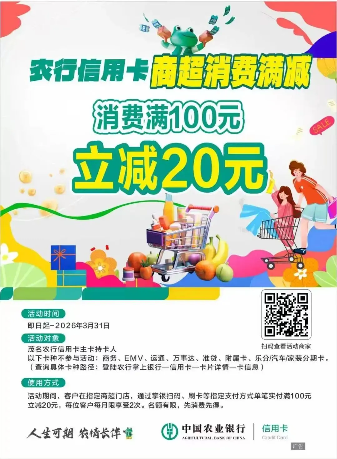 用农行信用卡到金港湾超市消费 满100元立减20元