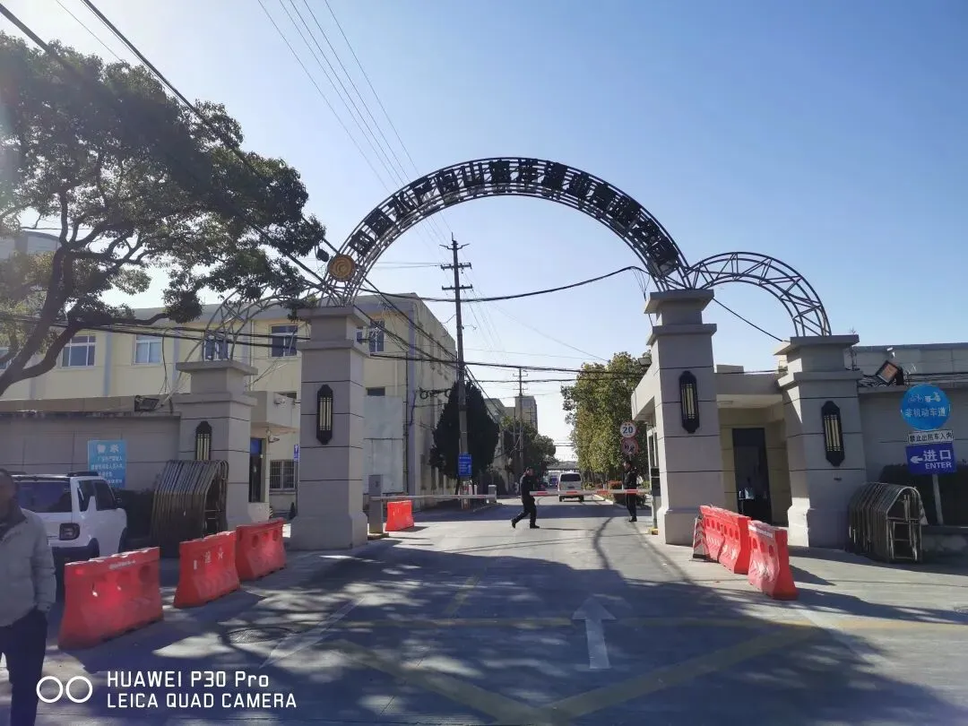 浅灰色石材立柱托起黑色金属拱顶,弧形钢架上镶嵌着醒目的企业名称,庄重而现代。大门内设有自动道闸,地面标有清晰的直行箭头,两侧摆放着红色塑料隔离墩,秩序井然。左侧一棵枝繁叶茂的大树静静伫立,远处是米黄色的厂房与交错电线,衬着湛蓝的天空,一切都透着敞亮。
