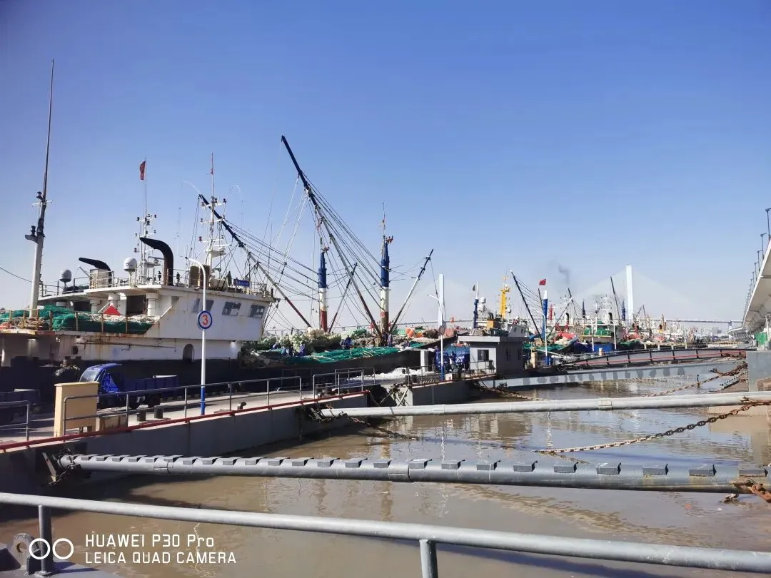 抬眼远眺,宏伟的白色斜拉桥横跨海面。浑浊的海水、密集的渔船、现代的大桥交织成一幅独特画面:传统渔业的厚重与现代交通的便捷在此相遇,滨海城市的活力扑面而来。