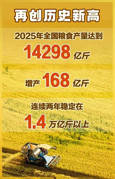 2025年,我国粮食生产再获丰收,“菜篮子”产品供给充裕。全国粮食产量达到14298亿斤、增产168亿斤,再创历史新高,连续两年稳定在1.4万亿斤以上。