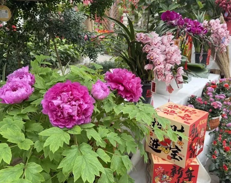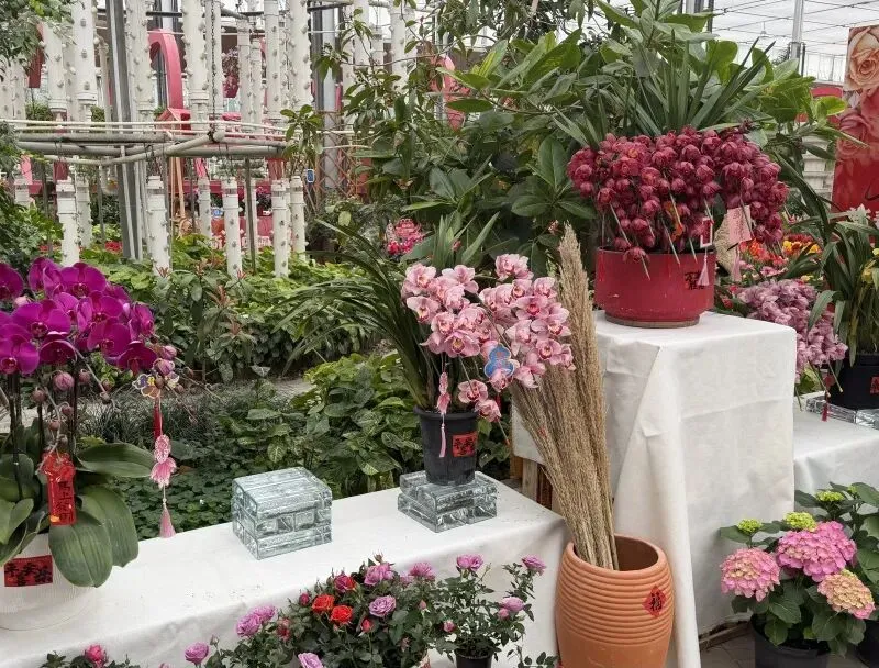 漫步花市,数十种鲜花绽放其间,蝴蝶兰、杜鹃、蕙兰等盆栽琳琅满目,春意满园。