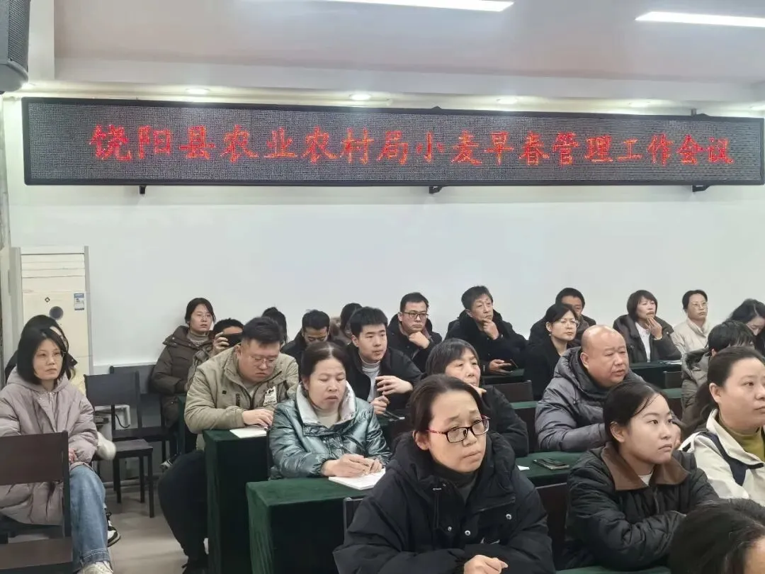 2026年2月13日,饶阳县农业农村局在四楼会议室召开小麦早春管理工作会议,会议由科技科科长耿青松主持,各相关业务科室及基层农技人员参会。