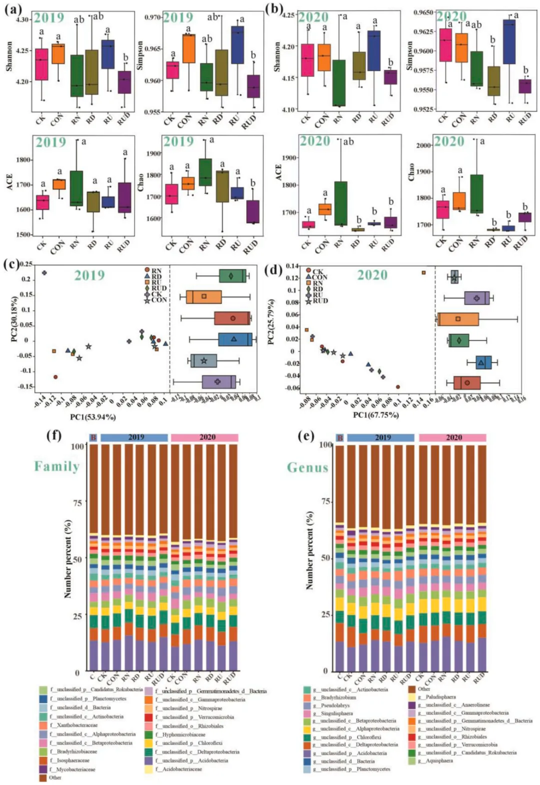 (a)和(b):六种处理方式下的土壤微生物α多样性指标(Shannon, Simpson, Chao1, ACE指数);(c)和(d):微生物群落组成的主坐标分析(PCoA);(e)和(f):不同处理方式下优势微生物分类群(属水平和科水平)的相对丰度。