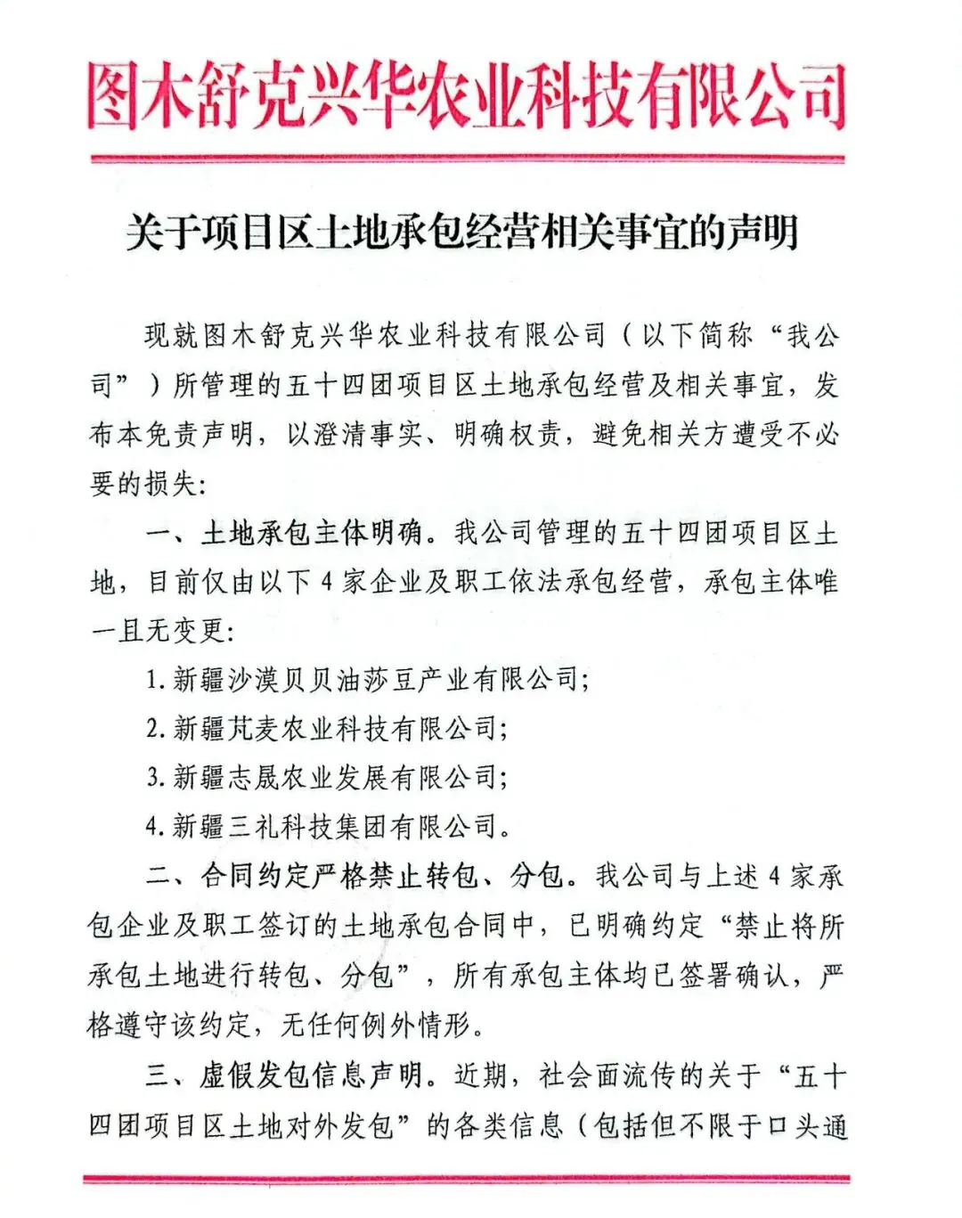 >图木舒克兴华农业科技有限公司:关于项目区土地承包经营相关事宜的声明