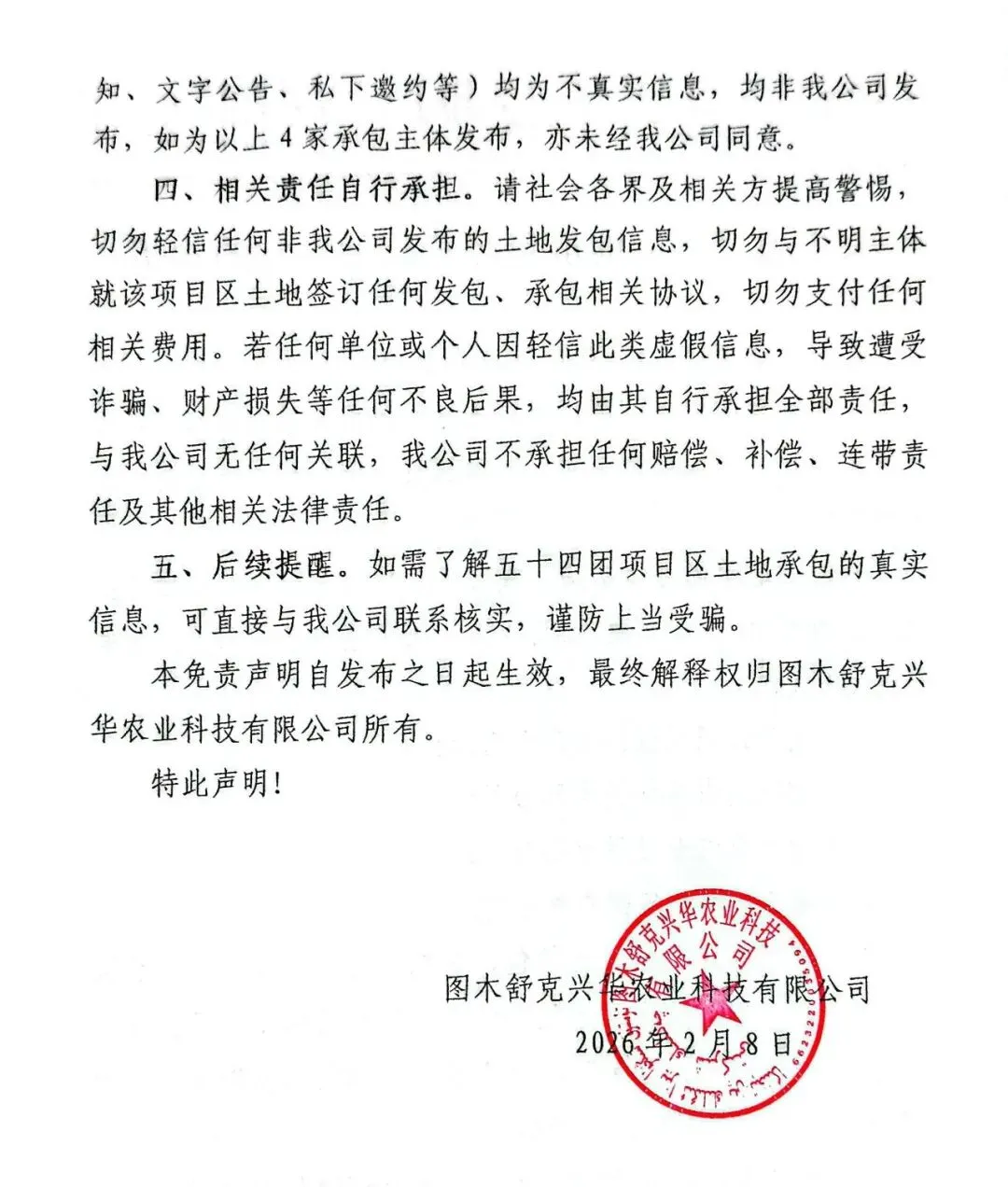 图木舒克兴华农业科技有限公司:关于项目区土地承包经营相关事宜的声明