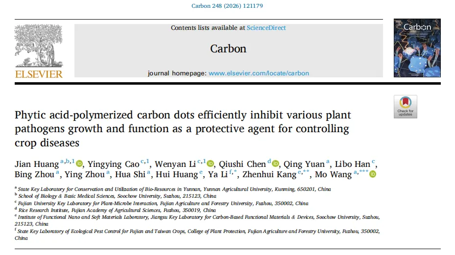 近日,云南农业大学植物保护学院王莫教授课题组在国际著名碳材料期刊Carbon(IF=11.6)上发表题为“Phytic acid-polymerized carbon dots efficiently inhibit various plant pathogens growth and function as a protective agent for controlling crop diseases”的学术文章,系统揭示了植酸碳点纳米材料抑制植物病原真菌和细菌的作用机理及其在作物病害防控中应用潜力。