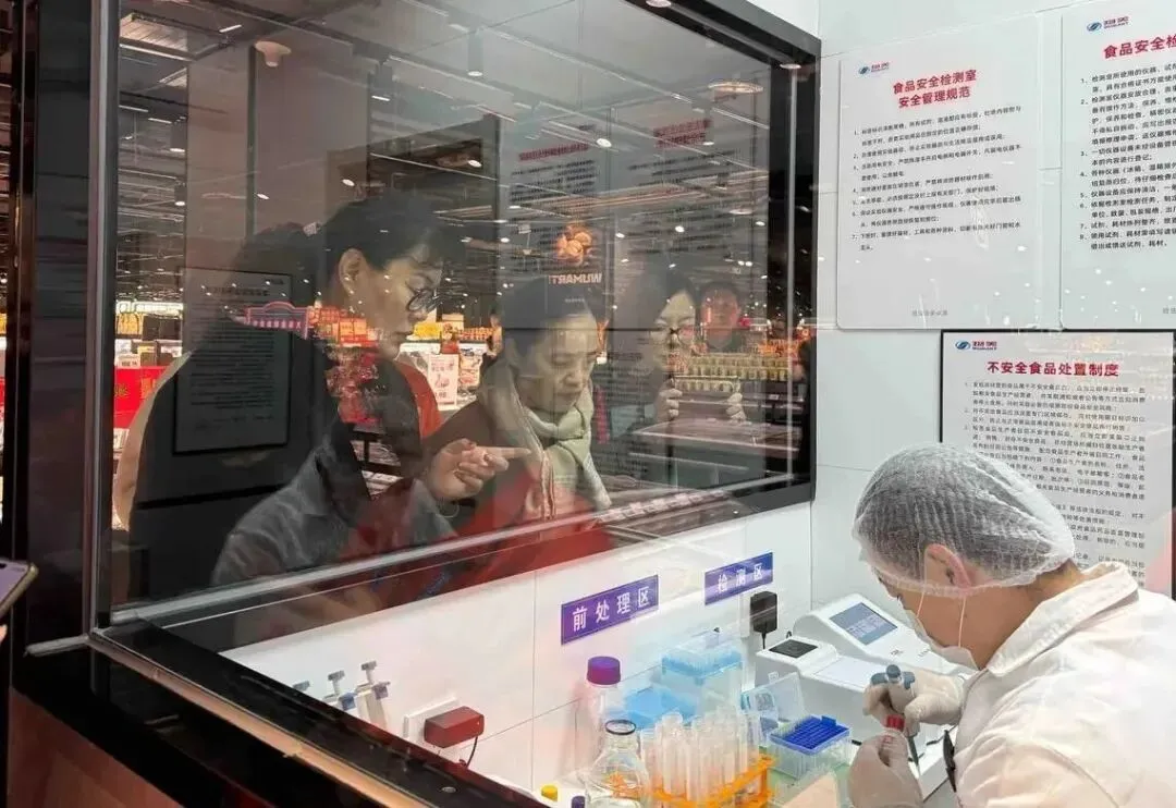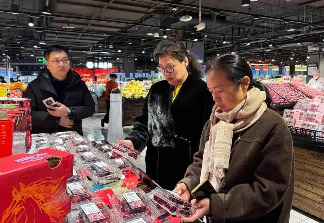 在生鲜果切区,马司长查看车厘子、油桃、菌菇类商品的品质、产地及物流管控情况,重点查看进口商品情况并扫描“承诺二维码”,仔细核查商品承诺内容,对超市的精细化管理给予肯定。许丽娜介绍,所有进入卖场的商品均需经过至少两次检测,调改升级后,门店专门增设食品安全监测室,每日随机抽取商品进行检测,检测结果实时公示,并通过AI系统计算打折力度,实现精准出清,保障新鲜度。