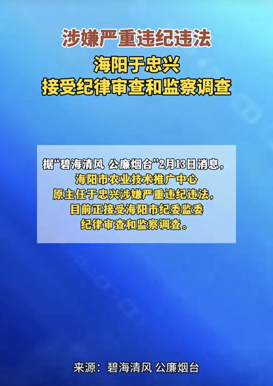 据“碧海清风公廉烟台”2月13日消息:海阳市农业技术推广中心原主任于忠兴涉嫌严重违纪违法,目前正接受海阳市纪委监委纪律审查和监察调查。