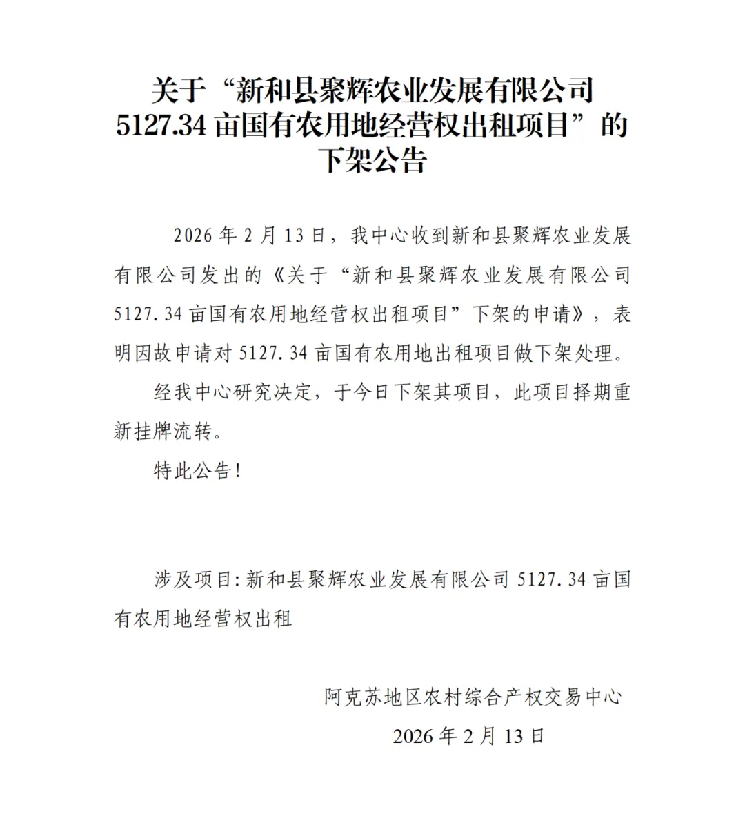 关于“新和县聚辉农业发展有限公司5127.34亩国有农用地经营权出租项目”的下架公告