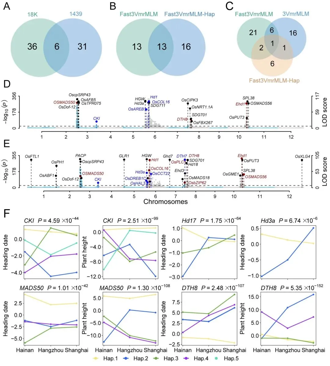 作物在不同环境中表现出显著的表型可塑性,其本质是基因对环境和气象因素的响应。围绕玉米开花期这一重要性状(图3A),本研究整合了来自12个环境的1,140份玉米自交系开花表型、437,214个SNP标记基因型和相应时空的气象数据,利用Fast3VmrMLM和Fast3VmrMLM-Hap方法,从多环境性状表型“直接”、性状对气象因素的回归参数“间接”两个层面系统挖掘GEIs(图3B),揭示不同地区玉米开花早晚差异的遗传×环境互作的遗传基础。