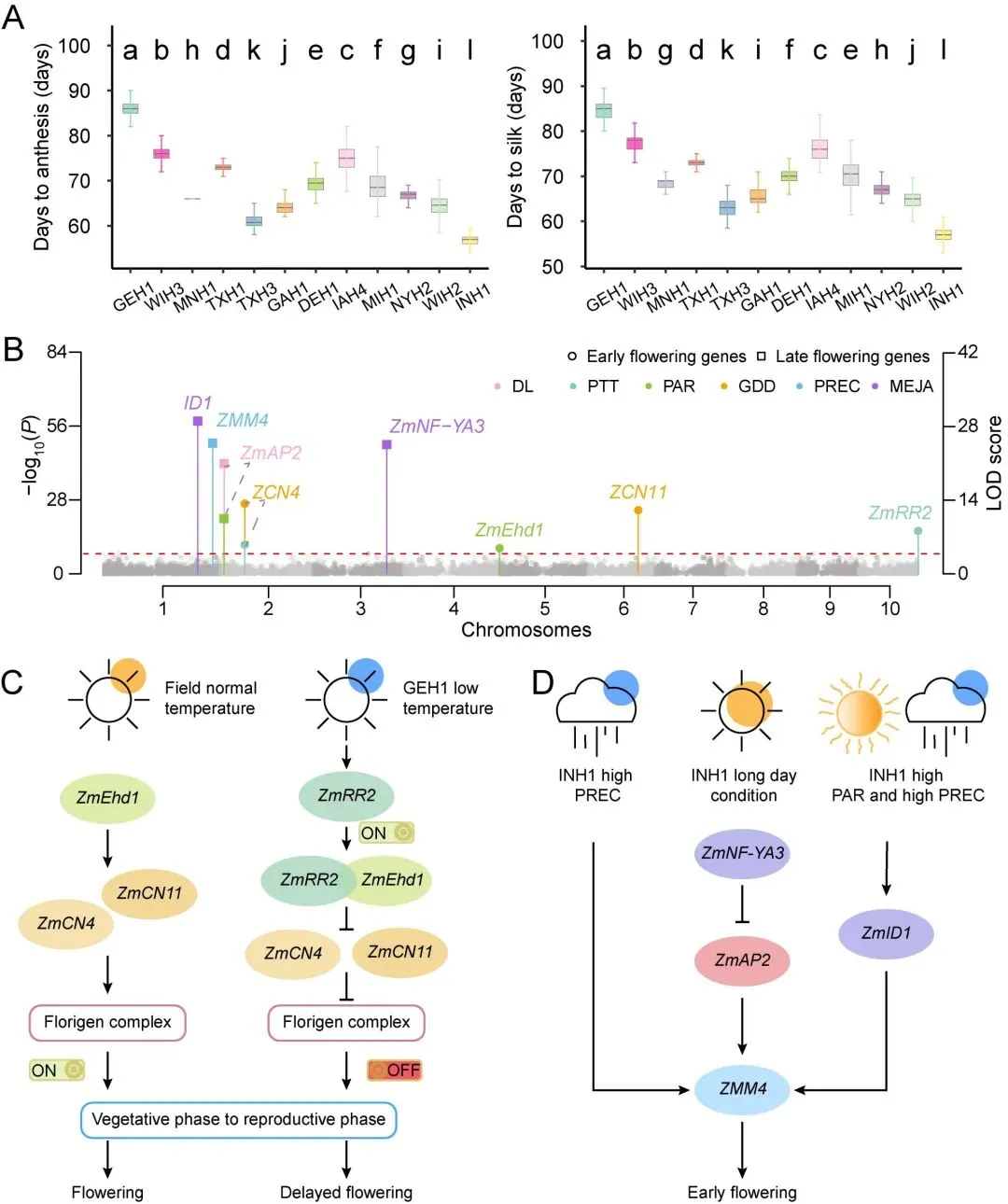 在德国哥廷根,由于生育早期有效积温显著偏低,低温环境增强了ZmRR2的表达量,并可能与ZmEhd1形成抑制复合体,从而抑制类成花素基因ZCN4和ZCN11的表达,延缓营养生长向生殖生长的转变,最终导致开花推迟(图3C)。该结果揭示了“低温—调控因子—成花”通路协同作用对区域性晚花现象的驱动机制。