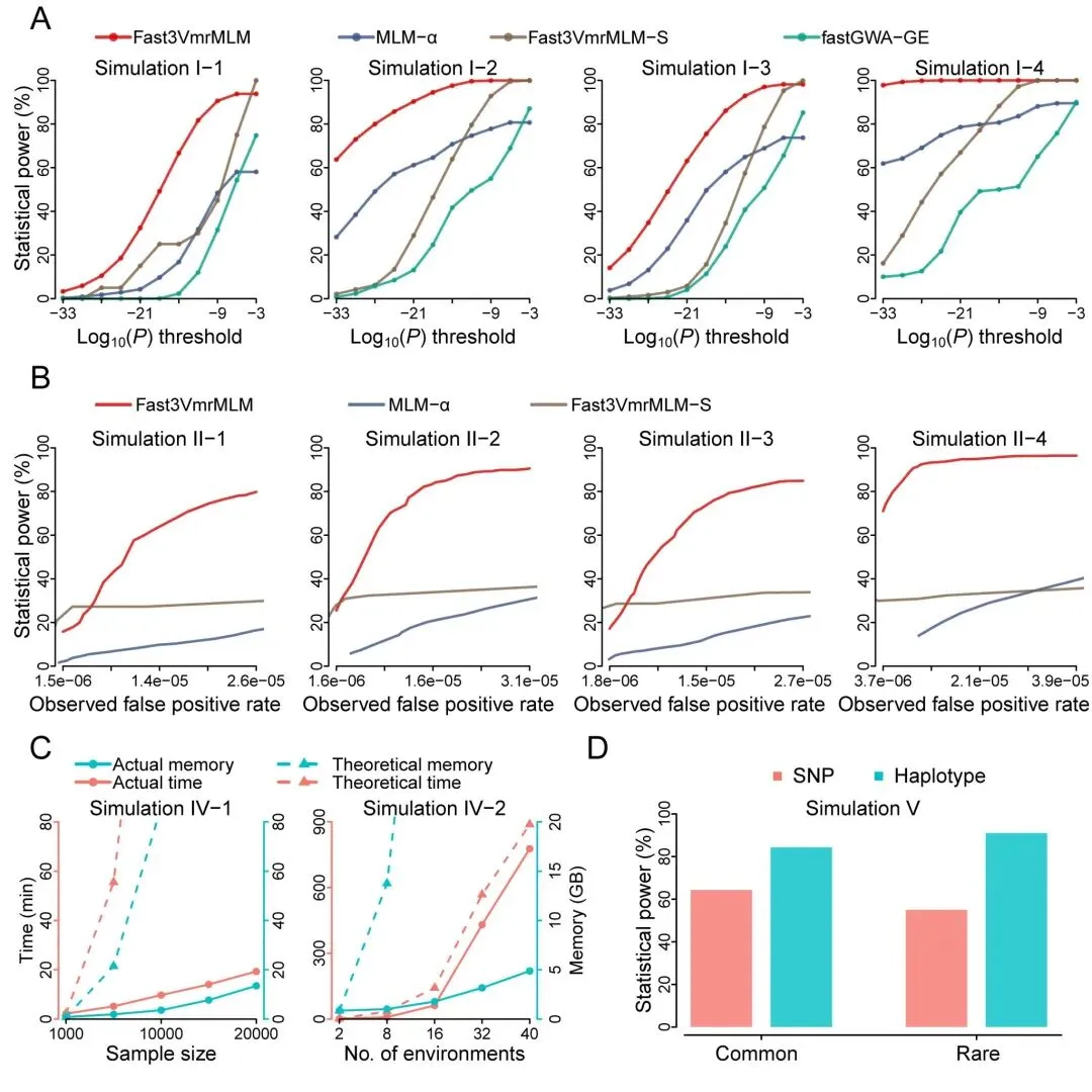 针对多年多点作物大群体数量性状表型、气象大数据和海量基因组信息带来的计算挑战,Fast3VmrMLM系统整合了八项先进的统计与计算技术,实现了高效、快速、大样本和低计算资源消耗的关联分析Fast3VmrMLM方法。新方法分析1,439水稻数据集的运行时间较原3VmrMLM方法缩短近50倍;在60线程和1TB内存的小型服务器上,成功完成了3VmrMLM、FarmCPU和EMMAX等现有方法无法实现的18K水稻和玉米G2F数据集分析。在Monte Carlo模拟研究中,新方法联合分析20,000个品种100万个标记和两个环境表型数据集仅需19.33分钟,内存占用13.51GB;1,000个品种100万个标记和40个环境表型数据集,耗时777.48分钟,内存占用4.88GB;20,000个品种100万标记和20个环境表型数据集,耗时48.01小时,占用22.70GB内存,使大数据遗传分析在小型计算设备上运行成为可能,突破了大数据的“算力壁垒”,为小团队分析大数据提供方法学平台。