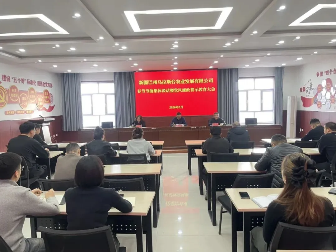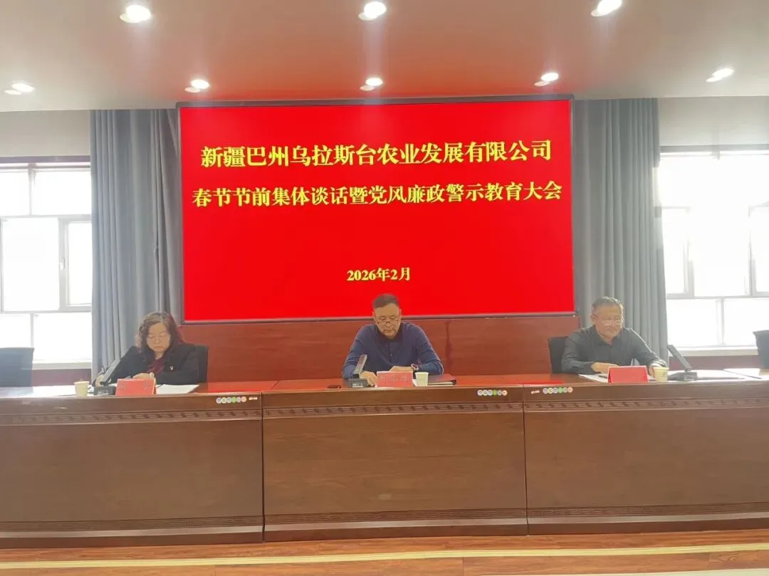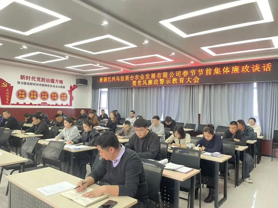 马年春节将至,为深入贯彻落实中央八项规定及其实施细则精神,严防“四风”问题反弹回潮,强化全体员工廉洁自律意识和安全责任意识,筑牢党风廉政建设思想防线,营造风清气正、平安祥和的节日氛围,2月12日,新疆巴州乌拉斯台农业发展有限公司召开春节节前集体廉政谈话暨党风廉政警示教育大会。会议由公司党委副书记、总经理阿拉西主持,全体员工参加会议,切实以严的基调、实的举措,为全体员工敲响廉政警钟、压实安全责任,确保大家守住“廉关”、过好“年关”,以清廉之风护航马年新春。