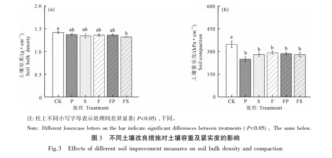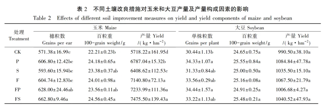 【结果】与 CK 相比,各改良措施下土壤紧实度显著降低,降幅为 15.90% ~ 28.19 %,玉米产量显著提高 12.07% ~ 30.73%。与 CK 相比,FS 处理土壤容重显著降低 7.01%,土壤团聚体平均重量直 径( MWD) 与几何平均直径( GMD) 分别提高 18. 26%、21. 96%,土壤有机质、全氮、有效磷含量分别显著增加44.70 %、74.22%、100.95%,玉米的穗粒数、百粒重、产量分别提升 16.11%、10.58%、30.73%。各改良措施对大豆产量和 百粒重提升效果不显著。