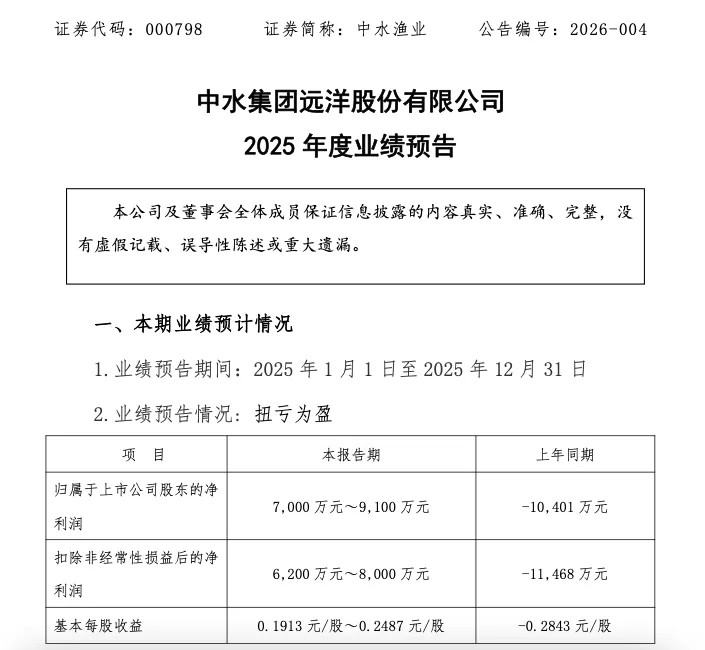 近日,中水渔业(000798)发布2025年度业绩预告,归属于上市公司股东的净利润7,000万元~9,100万元,扭亏为盈;扣除非经常性损益后的净利润6,200万元~8,000万元,扭亏为盈。