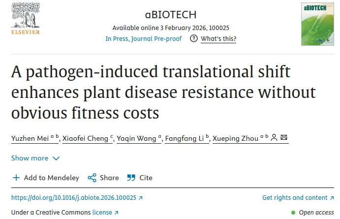 2026年2月3日,中国农业科学院植物保护研究所周雪平教授团队在《aBIOTECH》online发表题为 “A pathogen-induced translational shift enhances plant disease resistance without obvious fitness costs” 的研究论文,该研究成果系统建立了基于上游AUG(uAUG)调控植物抗病基因表达的技术体系,为抗病基因的高效利用与抗病种质创新提供了关键技术支撑。