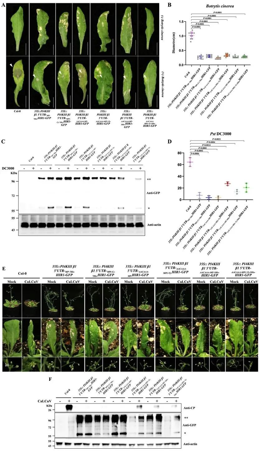 团队选取前期鉴定并证实对多种病原具有广谱抗性的HIR1基因(New Phytologist, 2020)为目标应用基因,通过转基因技术获得由PI4KIII β1 5'UTR casette元件驱动HIR1表达的稳定遗传材料。表型与产量性状分析表明,该转基因植株在叶片形态、单株种子重量等关键性状上与野生型无显著差异。对转基因植物进行接种试验进一步证实,该转基因材料对真菌、细菌和病毒均表现出优异的广谱抗病性。该研究鉴定并建立了一套利用蛋白质翻译重编程而特异性调控植物抗病基因表达的技术体系,为抗病基因的高效利用与抗病种质的快速创制提供了新思路。