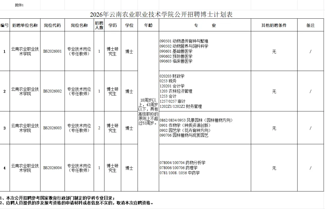 按照《事业单位公开招聘人员暂行规定》(人事部令第6号)《云南省事业单位公开招聘工作人员办法》(云人社发〔2016〕182号)等法律法规,根据工作需要,经云南省教育厅审核同意报云南省人力资源和社会保障厅核准,2026年云南农业职业技术学院面向社会公开招聘博士5名,现将有关招聘事宜公告如下。云南农业职业技术学院于2002年12月批准组建,是云南省教育厅管理的公益二类事业单位。学校以高原特色现代农业专业为优势和特色,集农业、食品药品、大健康、工程、经济管理、电子信息等多专业融合发展,是国家优质高职院校、全国乡村振兴人才培养优质校、云南省示范性高等职业院校、云南省社会主义核心价值观教育示范学校、云南省文明校园、云南省民族团结进步示范单位、全国新型职业农民培育示范基地、全国现代学徒制试点单位。坚持德才兼备的用人标准,招聘遵循“公开、平等、竞争、择优”的原则,面向社会,公开报名,统一考试,综合评定,择优聘用。2026年云南农业职业技术学院公开招聘博士5名。具体招聘岗位及招聘条件,详见《2026年云南农业职业技术学院公开招聘博士计划表》(附件1)。符合岗位条件要求和本公告其他要求的人员均可报名。具体招聘范围和条件,详见《2026年云南农业职业技术学院公开招聘博士计划表》。报名人员年龄在18周岁以上,43周岁以下,具有高级职称的原则上不超过53周岁。年龄计算截止日期2026年2月1日。3.具备招聘岗位所需的专业或任职资格、职业(执业)资格及技能要求;1.受到党纪、政纪处分期限未满或者正在接受纪律审查的人员;正在接受司法调查尚未作出结论的人员。2.因犯罪受过刑事处罚的人员、被开除中国共产党党籍的人员、被开除公职的人员、吸毒人员、被依法列为失信联合惩戒对象的人员,以及法律法规规定不得招聘为事业单位工作人员的其他情况的人员。3.聘用后即构成《事业单位人事管理回避规定》第六条所列情形的人员。应聘人员如实填写《云南农业职业技术学院博士应聘登记表》(附件2),连同本人身份证、毕业证、学位证(留学回国人员须提供教育部留学服务中心国外学历认证书)、本科及硕士阶段的学历学位证书、专业技术资格证、研究方向证明材料、工作经验证明材料、其他专业能力证明材料等扫描件以PDF打包压缩发送至邮箱ynavcrsc@163.com进行报名。网上报名时间:全年招聘,自公告发布之日至2026年11月30日。资格初审包括应聘资格审查和学术资格审查。资格初审由云南农业职业技术学院负责,采用人工审核的方式进行。用人单位根据个人应聘材料,按照招聘岗位的基本条件、学历及专业要求等方面对应聘人员资格进行审查,审查未通过的不进入学术资格审查环节。校学术委员会或学科领域专家组按照择优的原则对应聘人员开展学术资格审查。根据应聘人员的代表性学术成果、工作计划和专家推荐信等材料,开展学术业绩与岗位匹配综合评估,学术资格审查未通过的应聘人员不进入后续环节。资格审查贯穿公开招聘全过程,任何环节发现应聘人员不符合资格条件的,取消应聘或者聘用资格。3.报名时,应聘人员务必在提交报名信息前认真核对,确保信息无误,报名时所填专业须按照毕业证上的专业名称填写(含括号内的专业方向),因不准确填写专业名称,导致资格复审时因专业不符无法通过的,由应聘人员自行负责;4.弄虚作假或以其他不正当手段获取考试资格的应聘人员,取消本次应聘资格。资格初审合格者,参加现场资格复审,现场资格复审于面试前进行,具体时间地点将另行通知,请应聘人员关注云南农业职业技术学院网站(http://www.ynavc.com/)通知公告栏,并保持电话畅通。审核材料与报名材料相同。报名人员参加资格复审时须提交报名材料原件及复印件(1份),原件查验后现场退还。1.面试满分100分,所有岗位设最低合格分数70分,等额面试的岗位设最低合格分数80分。所有岗位面试成绩低于最低合格分数线者和等额面试成绩低于最低合格分数线者,均不得进入下一环节。面试主要考察应聘人员专业技能及适应岗位要求的业务素质与工作能力等。2.面试时间、地点、要求将另行通知公告,请应聘人员关注云南农业职业技术学院网站(http://www.ynavc.com/)通知公告栏,保持电话畅通。根据面试成绩按从高到低顺序,按照计划招聘人数等额确定参加考察的应聘人员。由云南农业职业技术学院组织开展考察工作,采取实地考察或信函考察等方式,考察内容主要包括政治素质、道德品行、能力素质、心理素质、学习和工作表现、遵纪守法、廉洁自律、教职工准入查询等情况。同时核实考察对象是否符合应聘岗位资格条件、提供的应聘信息和相关材料是否真实准确等情况。考察结果作为聘用的主要依据,教职工准入查询不合格的一律不予聘用。考察合格的应聘人员参加体检。由云南农业职业技术学院组织应聘人员到指定医院进行体检,体检费用由参加体检人员自理。应聘人员为孕产妇在孕产期的,经医院确认可以申请延期体检,待生产后或妊娠终止,按国家相关政策产休假结束一个月内进行体检。体检项目和标准按照《公务员录用体检通用标准(试行)》及操作手册执行。应聘人员对体检结论有疑问,应在接到体检结论通知之日起5个工作日内提出复检申请,由招聘单位组织一次复检,体检结果