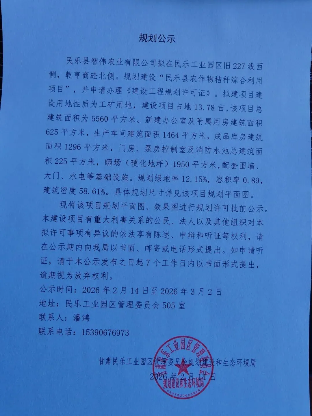 民乐县智伟农业有限公司民乐县农作物秸秆综合利用项目建设工程规划许可证批前公示