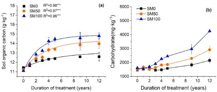 图1. (a)土壤有机碳(SOC)的时间动态;(b) 2007-2019年期间的土壤碳水化合物(中性糖)(n=3,误差条=SE)。星号表示单指数回归的显著性水平:*P<0.05、**P<0.01和***P<0.001。SM0,0%秸秆覆盖;SM50,50%秸秆覆盖和SM100,100%秸秆覆盖。