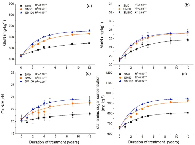图4. 2007-2019年氨基糖与木质素酚比率的时间动态(n=3,误差条=SE)。星号表示单指数回归的显著性水平:*P<0.05、**P<0.01和***P<0.001。SM0,0%秸秆覆盖;SM50,50%秸秆覆盖和SM100,100%秸秆覆盖。
