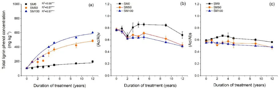 图3. (a)木质素酚总浓度的时间动态;(b) (Ac/Al)V和(c)(Ac/Al)S在2007年至2019年期间的变化(n=3,误差条=SE)。星号表示单指数回归的显著性水平:*P<0.05、**P<0.01和***P<0.001。SM0,0%秸秆覆盖;SM50,50%秸秆覆盖和SM100,100%秸秆覆盖。