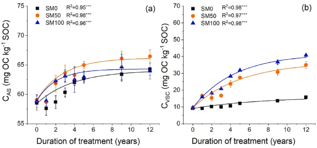 图5. 2007-2019年间(a)SOC中氨基糖的比例(CAS)和(b)SOC中木质素酚的比例(CVSC)的时间动态(n=3,误差条=SE)。星号表示单指数回归的显著性水平:*P<0.05、**P<0.01和***P<0.001。SM0,0%秸秆覆盖;SM50,50%秸秆覆盖和SM100,100%秸秆覆盖。