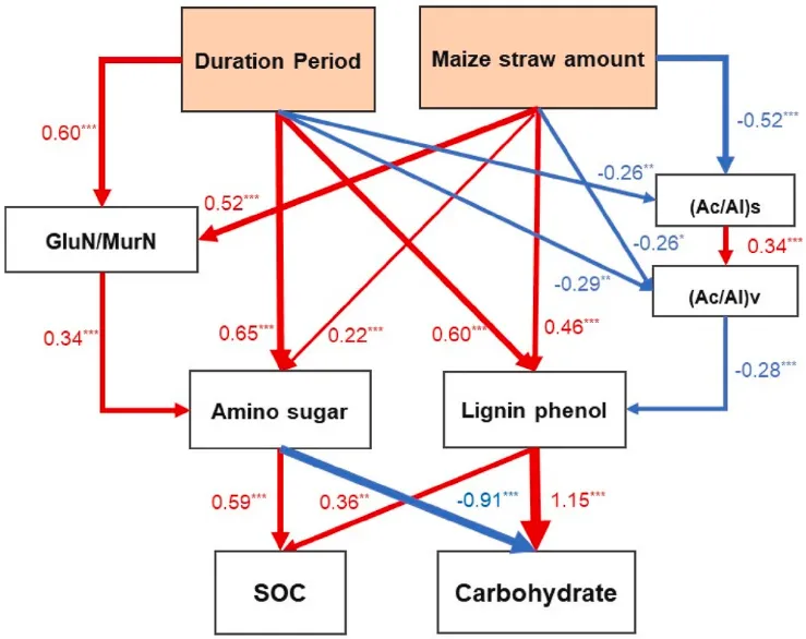 图6. 不同秸秆覆盖时间和数量下SOC组成来源(植物和微生物来源的成分)与SOC和碳水化合物含量之间假设因果关系的结构方程模型(SEM)。模型拟合:χ2=5.625,P=0.897,CFI=1.000,GFI=0.983,RMSEA=0.000。标准化路径系数(r,显著效应系数)列在每条路径旁边(红线表示正路径,蓝线表示负路径;线宽表示因子贡献的比例)。显著性影响:*P<0.05,**P<0.01,***P<0.001。