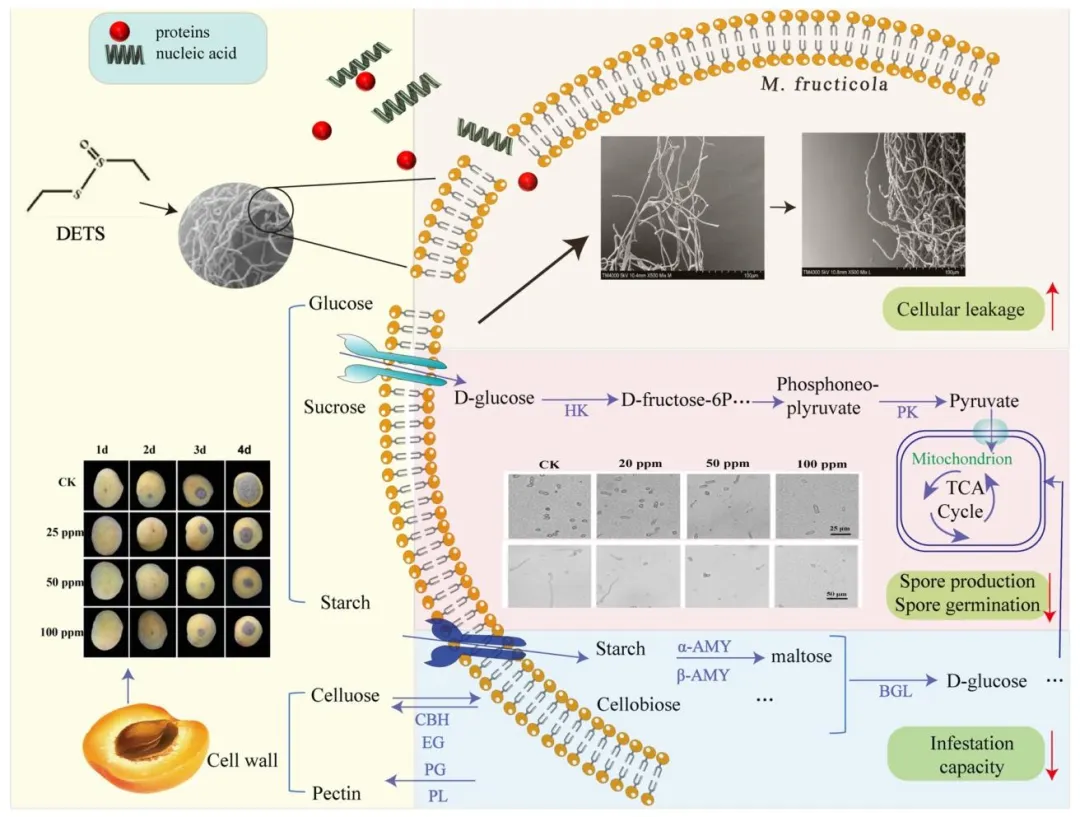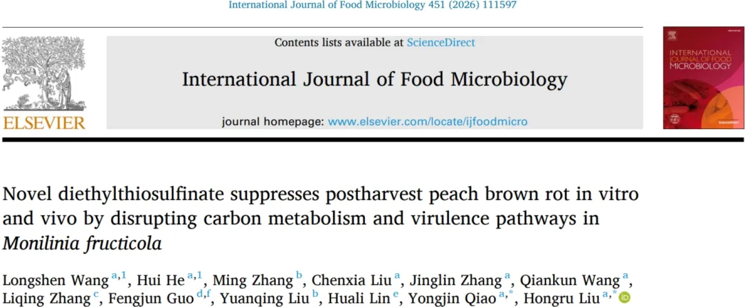 上海市农业科学院乔勇进研究员团队发现新型二乙基硫代亚磺酸盐通过破坏褐腐病菌的碳代谢及毒力通路,在体外和体内抑制采后桃褐腐病