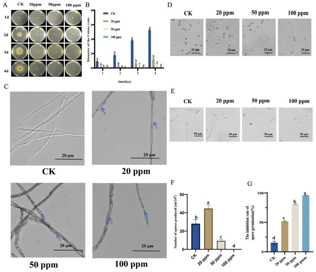 Fig. 1:二乙基硫代亚磺酸盐(DETS)对褐腐病菌(Monilinia fructicola)菌丝生长的影响。A. 不同浓度 DETS 在 PDA 培养基上对褐腐病菌的抑制效果;B. DETS 处理下褐腐病菌的菌落直径(cm);C. 不同浓度 DETS 处理后褐腐病菌的形态(箭头指示与对照组相比的显著差异区域);D. 不同 DETS 处理下褐腐病菌孢子繁殖的显微镜照片;E. 不同 DETS 处理下褐腐病菌孢子萌发的图像;F. DETS 处理对褐腐病菌孢子数量的影响;G. 不同浓度 DETS 对褐腐病菌孢子萌发的抑制率