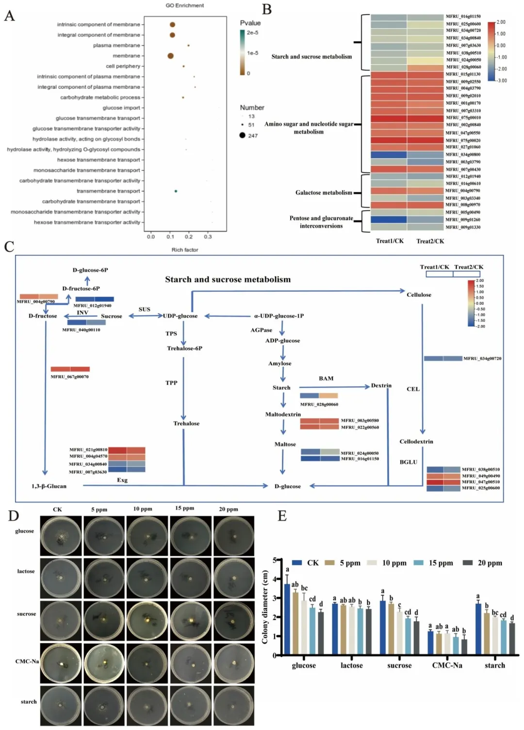 Fig. 3:DETS 对褐腐病菌碳代谢的影响。A. Treat1/CK 组和 Treat2/CK 组差异表达基因的 GO 条目富集分析;B. 淀粉和蔗糖代谢通路中差异表达基因的表达情况;C. 与碳源利用相关的差异表达基因热图;D. 不同浓度 DETS 下褐腐病菌对碳源的利用情况;E. 不同浓度 DETS 处理下褐腐病菌在碳源培养基上的菌落直径