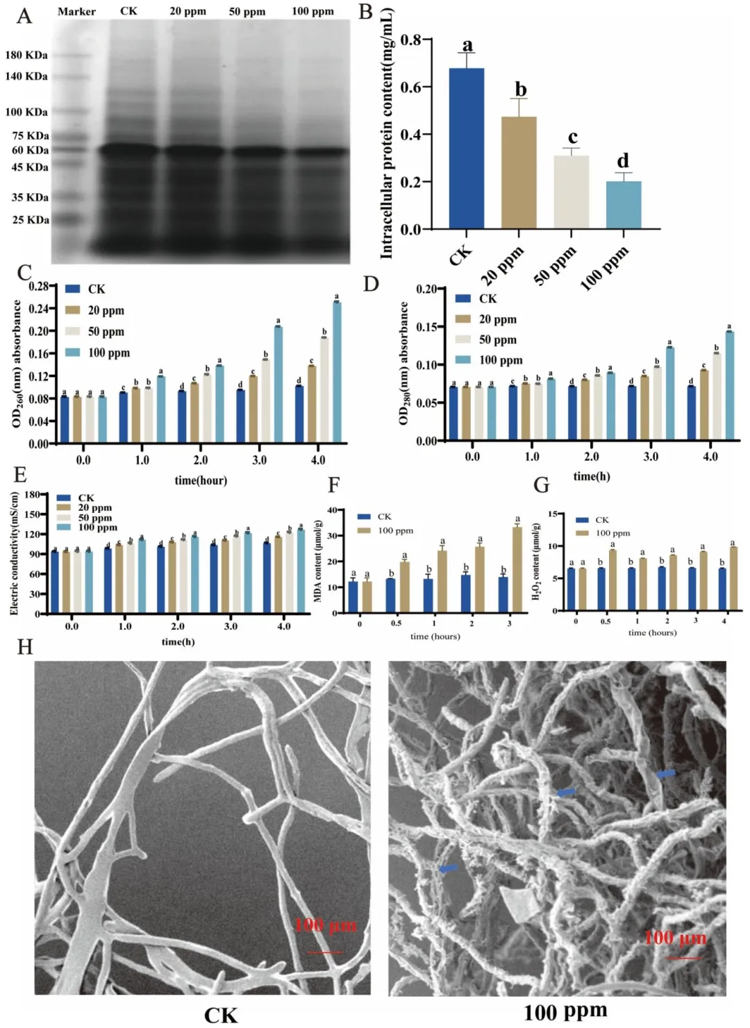 Fig. 4:DETS 对褐腐病菌细胞膜完整性的破坏作用。A. 褐腐病菌细胞内蛋白质含量;B. BCA 法测定不同 DETS 处理后褐腐病菌的细胞内蛋白质含量;C. DETS 处理下褐腐病菌细胞内核酸渗漏情况;D. DETS 处理下褐腐病菌细胞内蛋白质 / 碳水化合物渗漏情况;E. 褐腐病菌暴露于 DETS 后胞外电导率变化;F. DETS 处理后褐腐病菌的丙二醛(MDA)含量;G. 褐腐病菌暴露于 DETS 后的过氧化氢(H₂O₂)含量;H. 100 ppm DETS 处理后褐腐病菌的菌丝形态(箭头指示与对照组相比的显著差异区域)